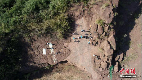 在上杭县发现的晚白垩世恐龙足迹群化石,现场正在挖掘。图片来源:上杭县委宣传部