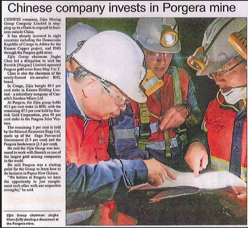巴理克(新几内亚)公司董事长陈景河为波格拉金矿管理点赞