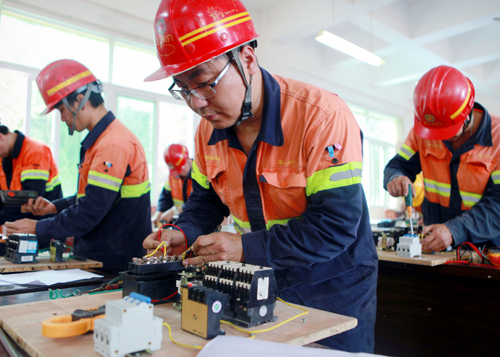 维修电工项目现场,选手们有的一丝不苟地剥着钢丝绳,有的快速安装线路接头,还有人用工具量、用笔算,个个屏神凝气,认真思考、反复琢磨……
