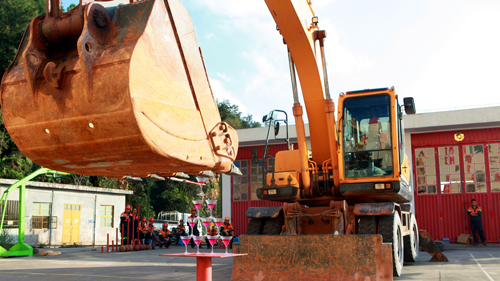 在紫金山金铜矿,参加重机驾驶项目的选手小林开着挖掘机将铲斗缓慢地伸出去,“手臂”下探,铲斗上特别安装的叉子轻轻地将香槟杯端起来,一只、两只、三只……期间“香槟”没有任何溢出,杯子全部整齐叠起。“漂亮!”观众击掌叫好。