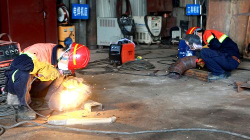 电气焊比赛现场焊花飞溅,铁锤叮当,50名焊工选手聚精会神、小心翼翼地画图纸、焊接手中的铁管,形成一道亮丽的风景线。