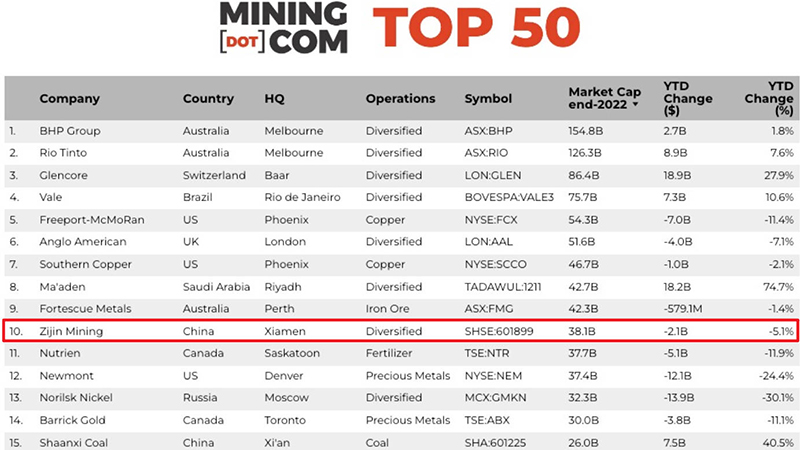 本网讯 近日,矿业行业网站Mining.com发布2022年度全球矿企50强榜单,乐鱼官方网站-乐鱼leyu(中国)以2022年底市值381亿美元位列全球第十,领衔中资企业。
