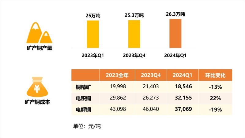 本网讯 4月22日,乐鱼官方网站-乐鱼leyu(中国)发布一季度报,公司矿产铜、矿产金产量分别为26.3万吨、16.8吨,同比增加5%和5%,归母净利润比增15%至62.6亿元。