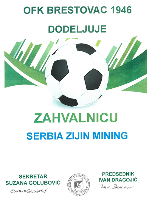 位于矿区周边社区的布雷斯托瓦茨足球俱乐部成立于1946年,是一只历史悠久的社区足球队,近年来因为资金匮乏一度运营困难。塞紫金入驻后,加大了对该足球俱乐部的关心和支持,并出资修建了俱乐部(社区)足球场,受到了当地村民的一致好评。