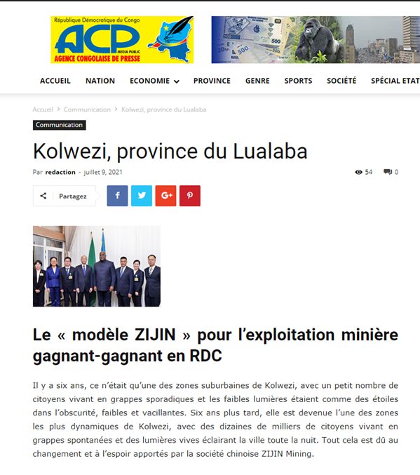 刚果新闻通讯社:刚果(金)矿业开发共赢的“紫金模式”——ACP :Le « modèle Zijin » pour l'exploitation minière gagnant-gagnant en RDC