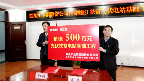 近日,多宝山铜业向嫩江县捐建扶贫光伏电站基础工程,总价值500万元。此项捐建工程为扶贫工程,将会选址在村级建设,既能发电又能增加村集体经济收入,将为嫩江县脱贫工作助力,为全县经济社会发展助力。