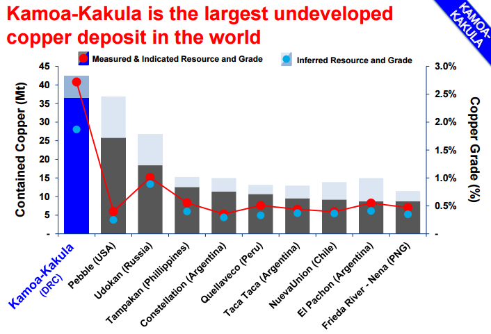 3.卡莫阿-卡库拉铜矿项目的重要意义:目前为止全球第四大铜矿,全球最高品位铜矿和全球最大未开发铜矿。以边界品位1%计算,卡莫阿-卡库拉铜矿项目控制级别+推断级别的铜金属资源量合计为4,249万吨,矿石量为16.55亿吨,平均品位为2.56%。而且,根据目前的勘探进展,卡莫阿-卡库拉铜矿项目的矿体边界仍未封闭,存在较大的找矿前景。加密和边部的钻探工作仍在开展,用以升级资源级别和控边工作。初步预计一期开发计划年产铜金属量40万吨,二期再翻倍至80万吨。