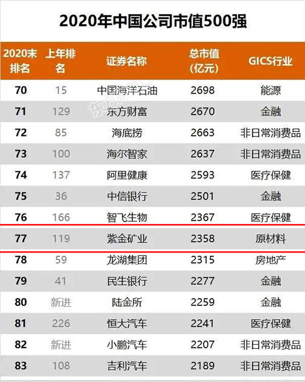 该榜单统计对象为在沪深港美上市的中国内地公司。数据显示,2020年末,500强企业总市值约86万亿元,同比上涨35%。上榜门槛也较去年大幅提升至386亿元,创历史新高。