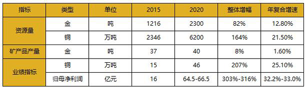 过去五年,公司全面适应经济发展新常态带来的新挑战,坚持“改革、增长、发展”三大任务,各项指标任务超预期实现,续写了全球金属矿业行业的“紫金奇迹”。2020年,公司预计实现归母净利润64.5-66.5亿元,公司总市值从2015年的759亿元上升2249亿元,上涨约200%。公司金、铜等战略性矿产资源量和产量显著增长,拥有超过2300吨金和6200万吨铜,其中铜资源储量相当于中国总量的一半,哥伦比亚武里蒂卡金矿、刚果(金)卡莫阿铜矿、塞尔维亚佩吉铜(金)矿、紫金波尔铜矿以及西藏驱龙铜矿等一批具有世界级影响力的矿山成为公司跨越式发展的雄厚基础。