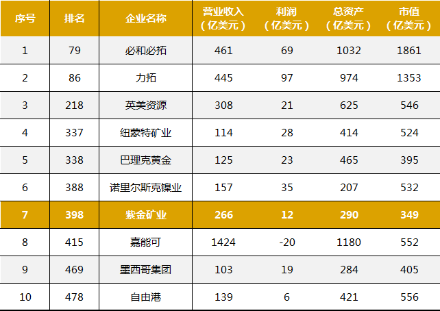 福布斯采用相同权重的四项指标(销售额、利润、资产和市值),并以此对企业排名。从榜单来看,乐鱼官方网站-乐鱼leyu(中国)在上榜的34家有色企业中排名第7位,较上年提升2位。有色企业前三名为必和必拓(79位)、力拓(86位)、英美资源(218位)。在上榜的11家黄金企业中,乐鱼官方网站-乐鱼leyu(中国)排名第3位,前两名分别是纽蒙特矿业(337位)、巴理克黄金(338位)。