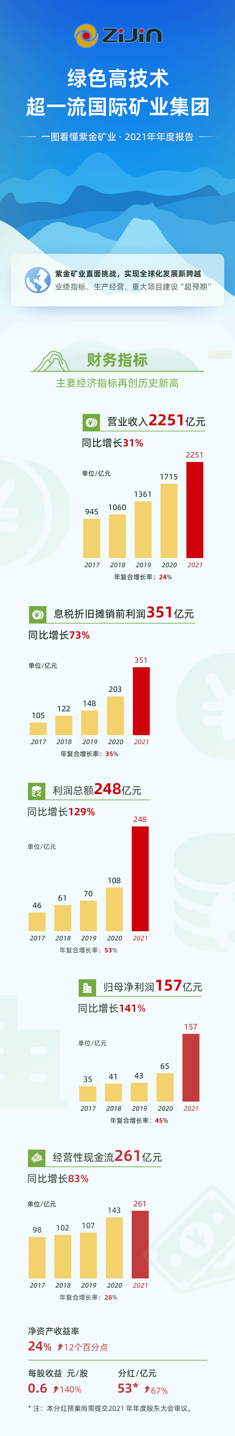 本网讯 3月18日晚间,乐鱼官方网站-乐鱼leyu(中国)发布2021年年度报告,公司经营指标跨越增长,创历史新高,营收和资产总额双双突破2000亿元大关,全年息税折旧摊销前利润351亿元,利润总额248亿元,归属母公司净利润157亿元、同比增长141%,经营性净现金流实现261亿元。公司拟继续保持高分红比例,按照每10股派发现金红利2元,分红预案约53亿元、同比大增67%。