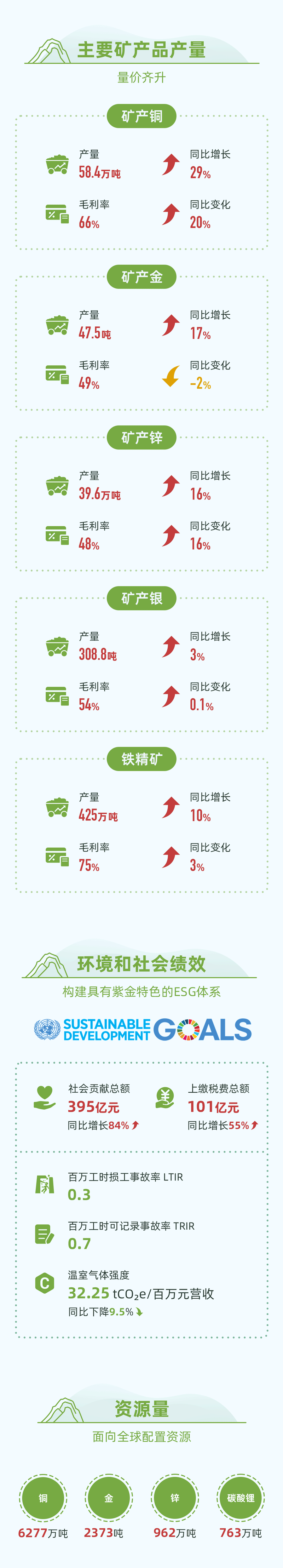 公司抓住机遇,加大马力推动资源优势向经济社会效益转变,全年实现矿产铜58.4万吨、矿产金47.5吨、矿产锌(铅)43.4万吨、矿产银309吨、铁精矿425万吨,同比分别增长29%、17%、15%、3%和10%。公司矿产品毛利率显著提升,达到58.98%,盈利能力好于行业整体平均水平。
