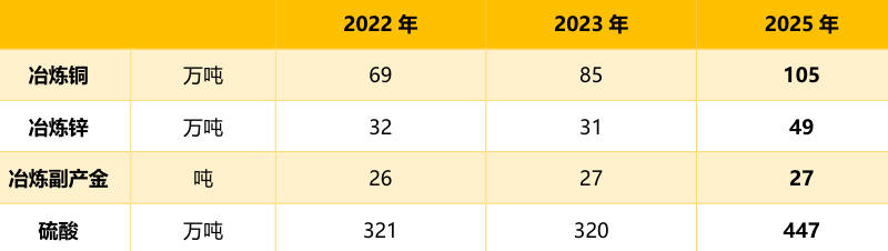 在主要矿产品产量方面,《纲要》指出,公司将采取坚决有效措施,实现已有矿产资源全面高效开发,产能稳步提升。其中矿产铜2023年95万吨、2025年117万吨;矿产金2023年72吨、2025年90吨;矿产锌/铅2023年45万吨,2025年48万吨;矿产银2023年390吨,2025年450吨;碳酸锂2023年0.3万吨,2025年12万吨;矿产钼2023年0.6万吨,2025年1.6万吨。