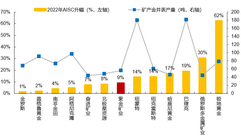 2022年全球伦敦金现货均价约1800美元/盎司,是有史以来最高的年度均价,全球黄金企业理应收获不菲业绩,但事实并非如此。如下表所示,全球前十大黄金公司合计营业收入增长5%,但合计归母净利润却同比下降45%,更令人意外的是,10家黄金公司中仅2家公司实现业绩正增长。这其中的确包含着资产减记等一些非经常性因素,但不可否认的是,全球能源、燃料、人工成本的不断增加,ESG要求越来越高,金矿商的运营成本压力正越来越大,如何构建成本竞争力成为金矿商亟需去解决的重要问题。