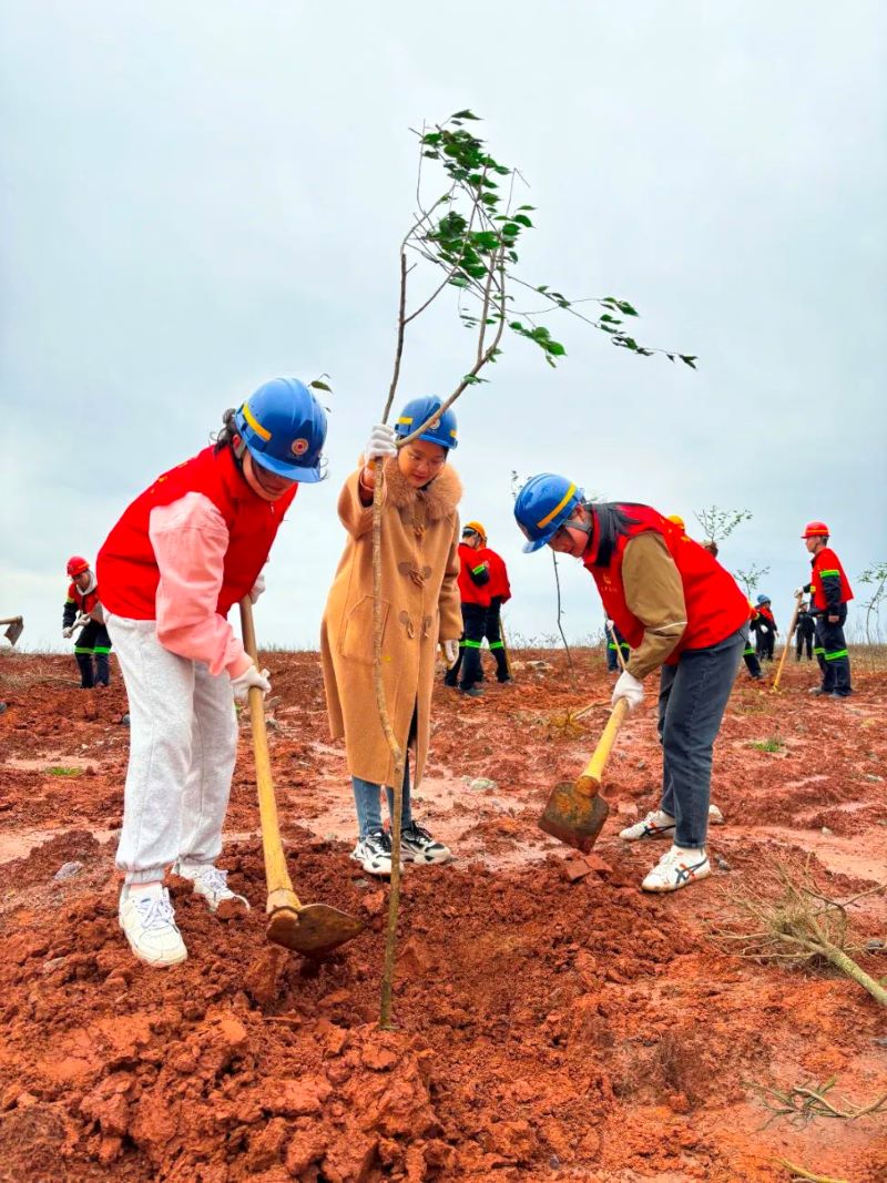 大家团结协作、干劲十足,认真细心的栽植扶正每一棵树苗。刚种下的300余棵树苗昂然挺立,生机勃勃,为初春的矿山增添了一抹绿色。