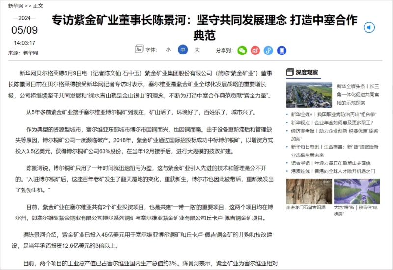 央视记者在一条超5分钟的关于紫金的专题报道中也表示,中国企业在帮助塞尔维亚提高经济效益的同时,也把高质量可持续发展的理念带到了塞尔维亚,要“金山银山”更要“绿水青山”。
