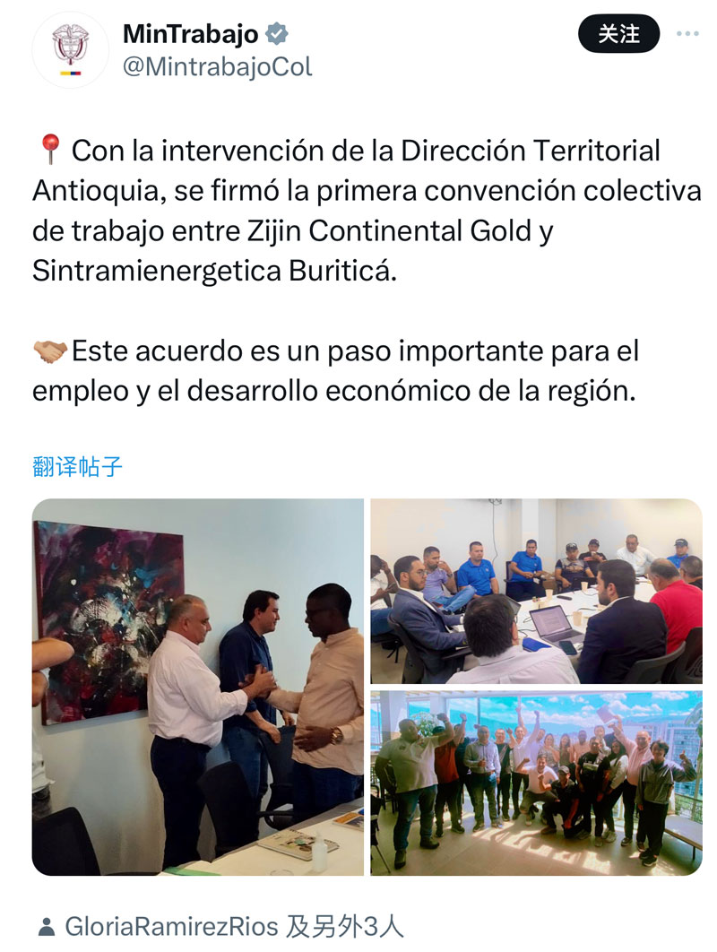 哥伦比亚劳工部两次在官方社交媒体上推文,认为大陆黄金此次工会协议的签署,是地区就业与经济发展的典范。