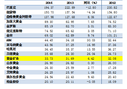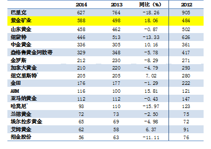 表1 2014年国内外主要黄金公司矿产金产量(吨)